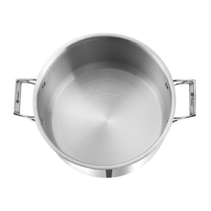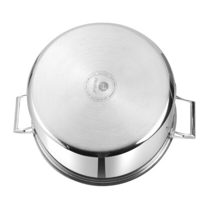 Healux Tiana Triply 30cm Biryani Pot is made using a cutting edge technology and 3-layer construction, consisting of 304 Stainless steel (surgical grade) inside, Aluminium in the centre and magnetic steel outside. The 304 Stainless steel inside allows you to cook food without oil or with minimum oil. The satin finish inside prevents food from sticking. The magnetic stainless steel exterior makes it suitable for use on induction stove tops. The Aluminium core throughout the Biriyani pot delivers even heat distribution without hot spots